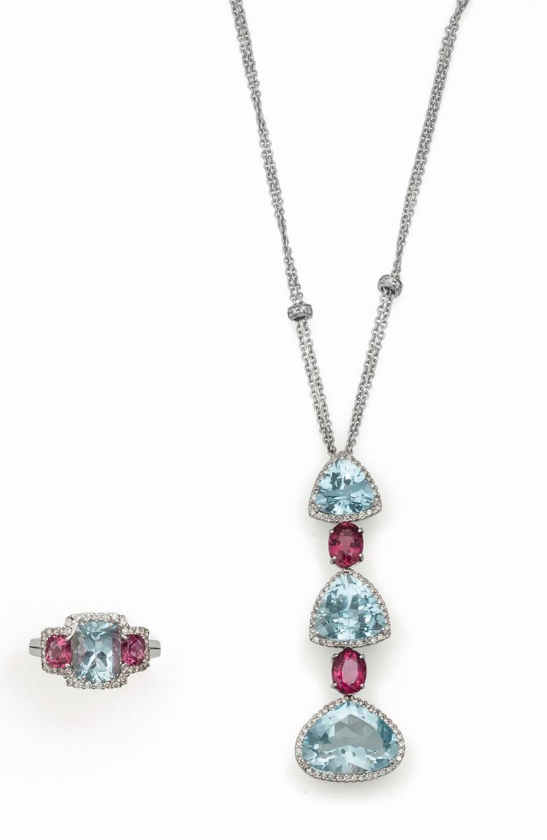 Lotto composto da anello e girocollo con acquemarine e tormaline