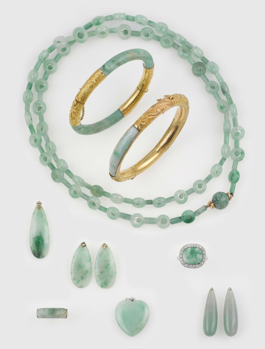 Lotto di giadeiti composto da: due bangle, un girocollo, due anelli, due pendenti, un paio di orecchini e due gocce