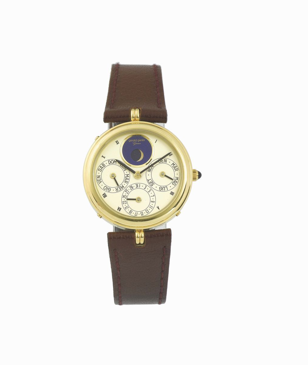 GERALD GENTA, Genève, Automatic, cassa No. 25847, Ref. G2233.4, orologio da polso, in oro giallo 18K, astronomico, automatico, calendario perpetuo, fasi lunari, con fibbia Gerald Genta in oro 18K. Realizzato nel 1990 circa. Accompagnato da scatola originale e Garanzia.
