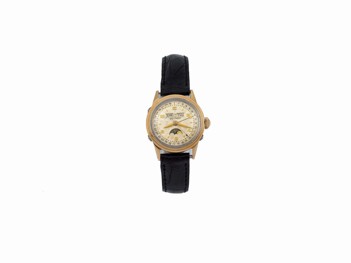 MOVADO, orologio da polso, in acciaio e laminato oro con triplo calendario e fasi lunari. Realizzato circa nel 1940