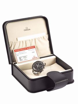 OMEGA, Speedmaster - Professional, Ref. 35725000, orologio da polso, cronografo, in acciaio, impermeabile, con ghiera tachimetrica, bracciale Omega e chiusura deployante. Venduto nel 2000. Accompagnato da scatola, garanzia e maglie aggiuntive.