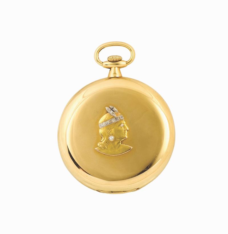 CASSA: Quattro corpi, lucidata, coperchio frontale raffigurante dama con diamanti, cerniera interna in oroQUADRANTE: Bianco in smalto con numeri Breguet, pista interna dei minuti, contatore ausiliare per i secondi. Sfere BreguetMOVIMENTO: Dorato, scappamento ad ancora, bilanciere bimetallico, spirale BreguetQuadrante, cassa e movimento firmati, in buone condizioniDIAMETRO: 48 mm