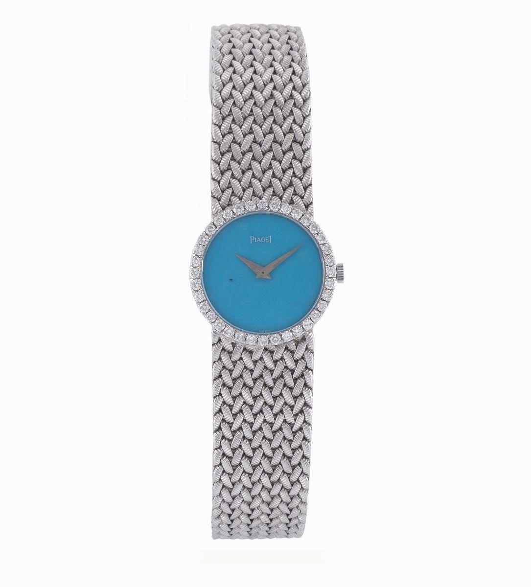 CASSA: Due corpi, lucidata e satinata, fondello serrato da viti, vetro zaffiro, lunetta con brillantiQUADRANTE: Turchese con sfere in oro bianco di tipo DauphineMOVIMENTO: Cal. 9P, rodiato, scappamento ad ancora, bilanciere monometallico, spirale pianaQuadrante, cassa e movimento firmati, in ottime condizioniDIAMETRO: 25 mm SPESSORE: 5 mm