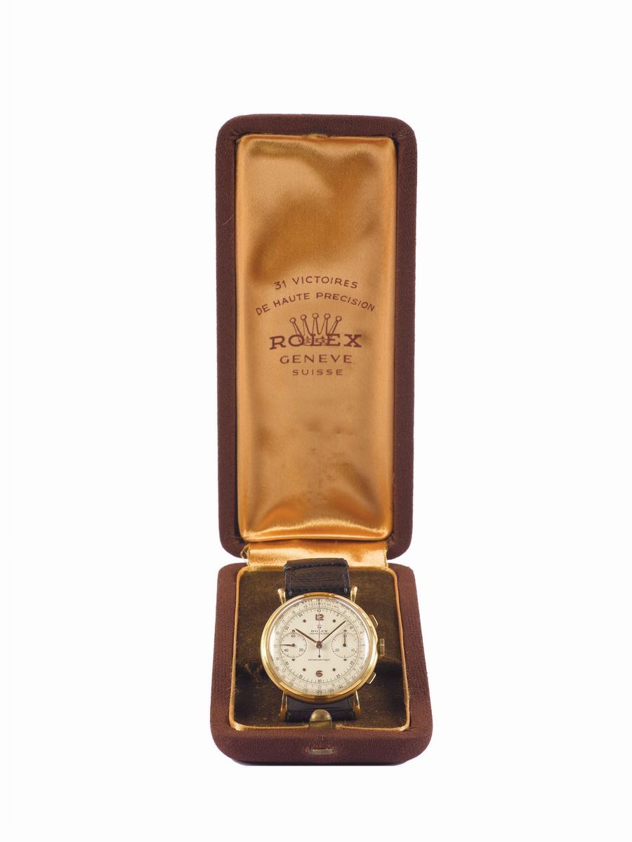 CASSA: Tre corpi, lucidata e satinata, anse a goccia, lati della cassa a moneta, lunetta a gradino, fondello a scatto.QUADRANTE: Argento con indici in oro e numeri Arabi, contatori dei secondi e dei minuti, pista dei minuti interna, scala tachimetrica esterna in nero, scala telemetrica interna blu. Sfere in oro a bastone.MOVIMENTO: Cal. 23, rodiato, 17 rubini, scappamento ad ancora, bilanciere monometallico, spirale Breguet.Quadrante, cassa e movimento firmati, in buone condizioniDIAMETRO: 36 mm SPESSORE: 11 mmNOTE: La referenza Rolex 4062, è tra i cronografi non Oyster, che riuscì a riscuotere un grande successo. Apparve in catalogo tra il 1943 e il 1962.