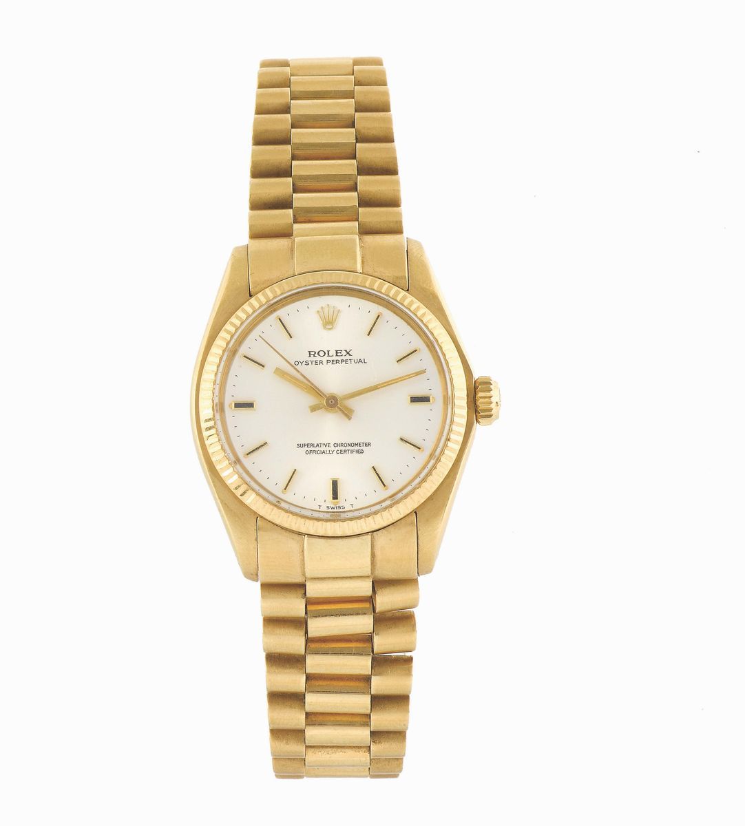 ROLEX, “Oyster Perpetual, Superlative Chronometer, Officially Certified”, Ref. 6751, cassa No. 6204398, orologio da polso, automatico, impermeabile, in oro giallo 18K con bracciale Rolex President in oro giallo. Accompagnato da scatola originale. Realizzato circa nel 1980.