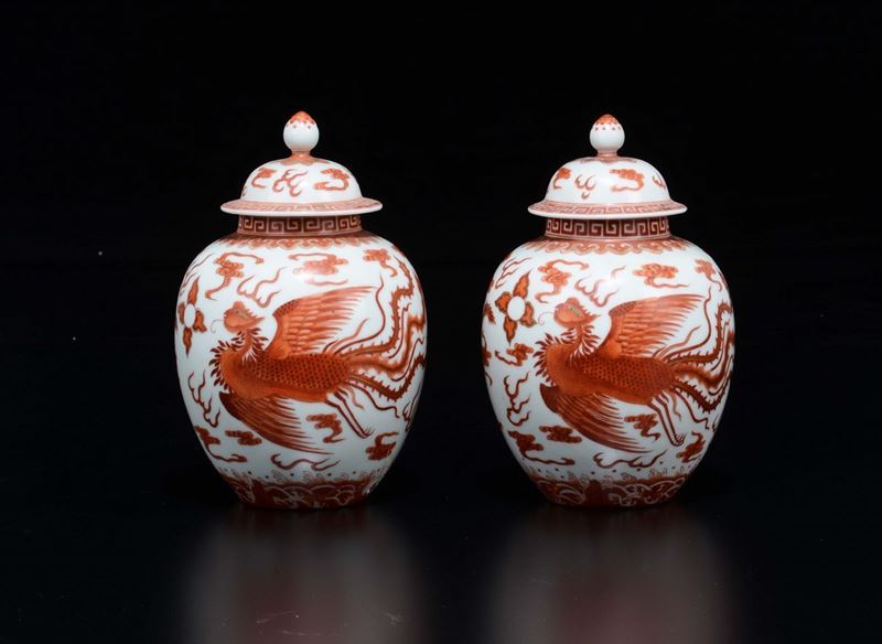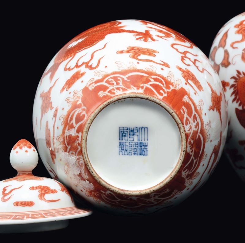 Coppia di piccole potiches con coperchio in porcellana a smalti policromi con decoro di draghi rossi, Cina, Dinastia Qing, [..]