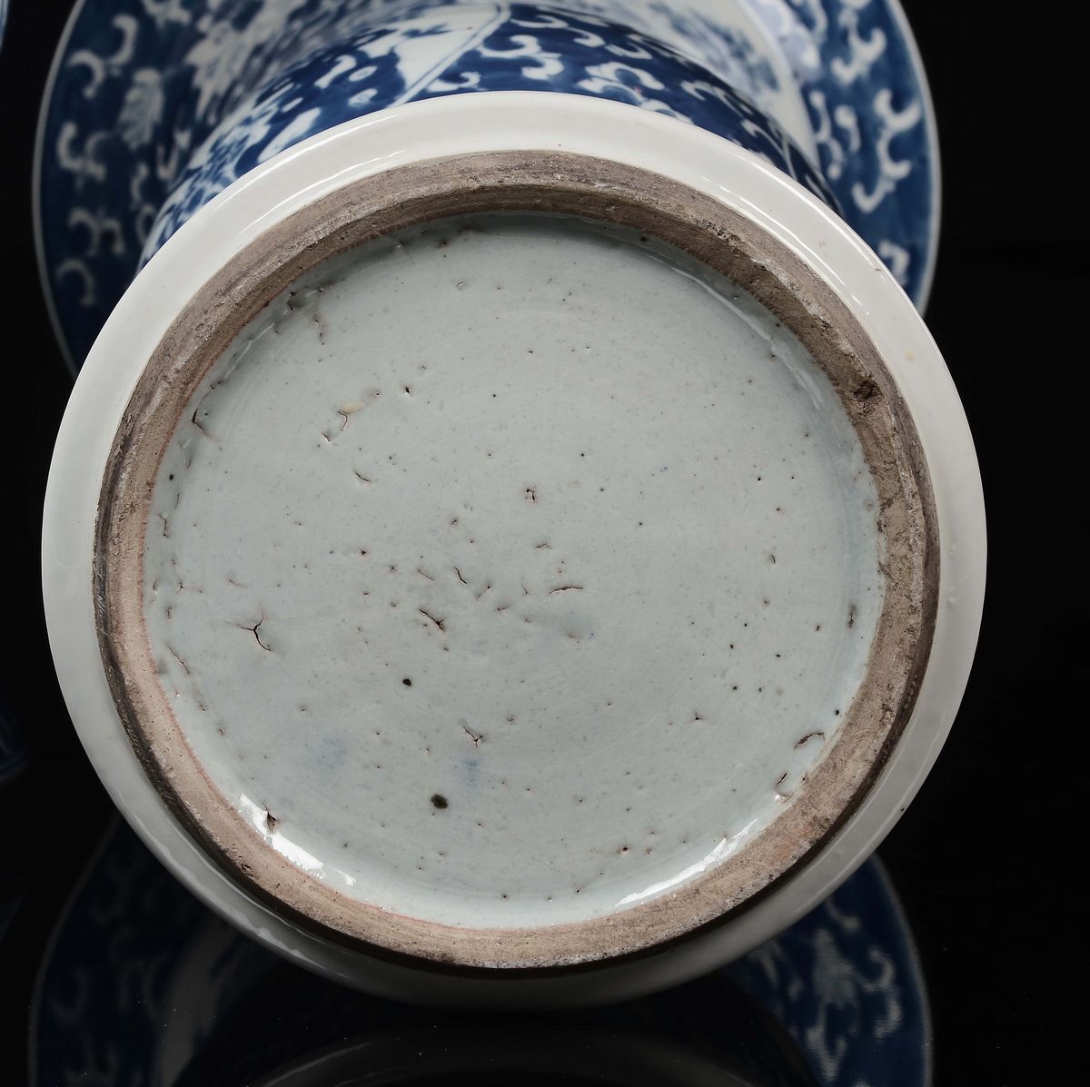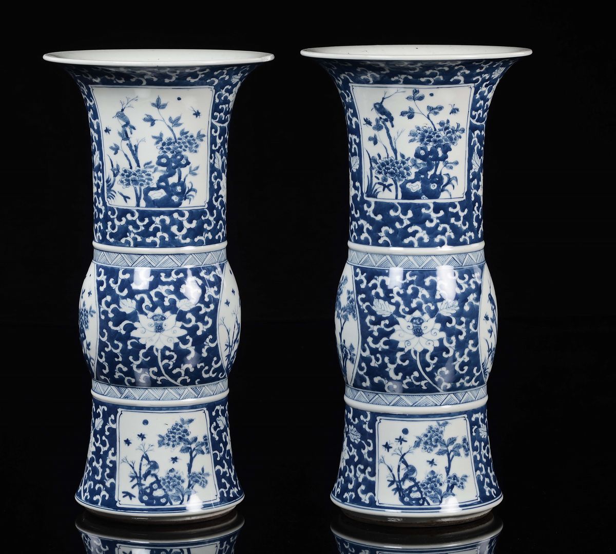 Coppia di vasi a tromba in porcellana bianca e blu con riserve con volatili e fiori, Cina, Dinastia Qing, XIX secolo
