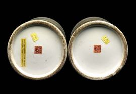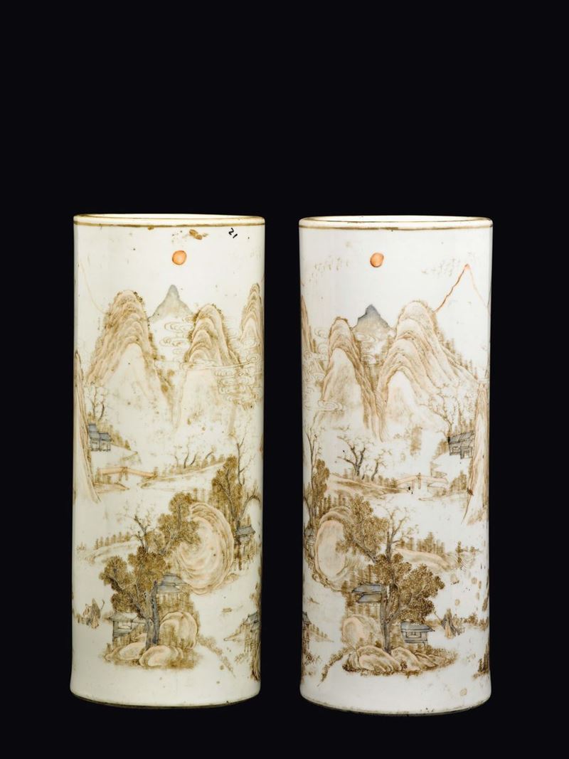 Coppia di vasi in porcellana a decoro paesaggistico, Cina, Dinastia Qing, XIX secolo