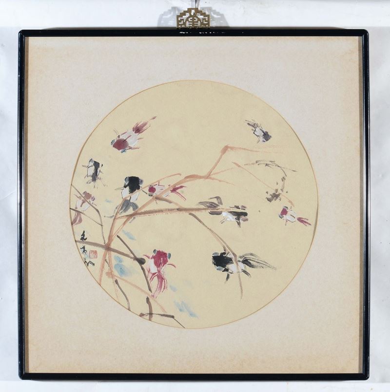 Due acquarelli su carta raffiguranti pesci e rami in fiore, Cina, XX secolo