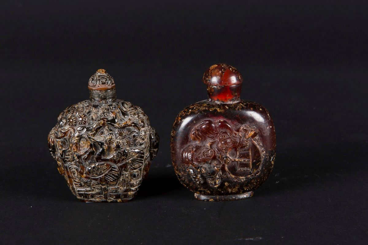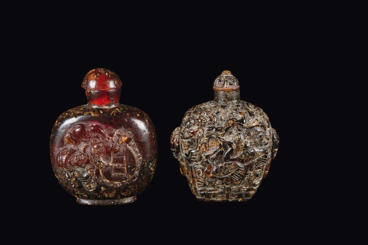 Due snuff bottles in ambra, una con decoro di gru ed una con personaggi a rilievo, Cina, Dinastia Qing, XIX secolo