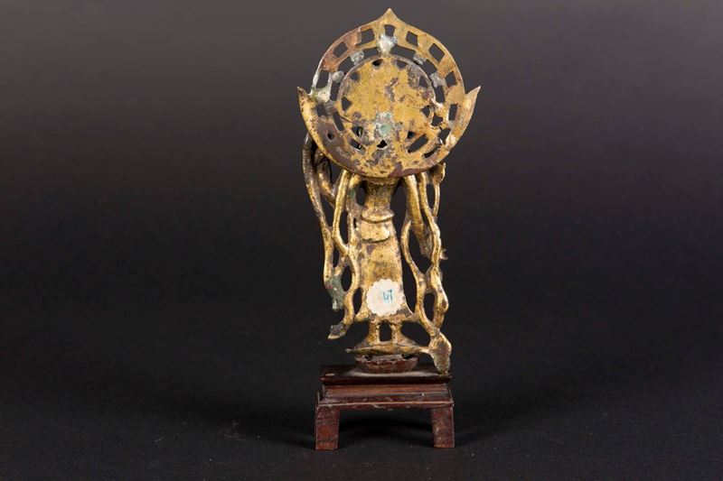 Figura di Avalokitesvara eretta con aura in bronzo con tracce di doratura, Cina, Dinastia Tang (618-906)