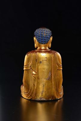 Figura di Buddha seduto in legno laccato e dorato, Cina, Dinastia Qing, XVIII secolo