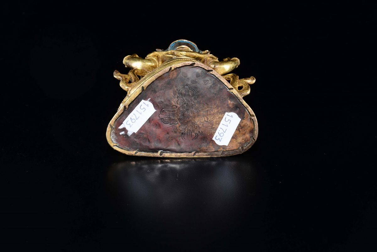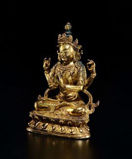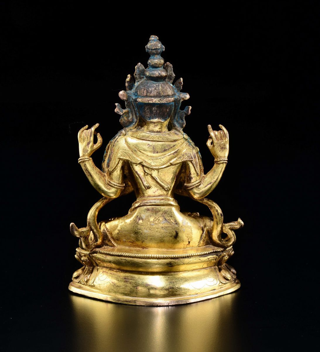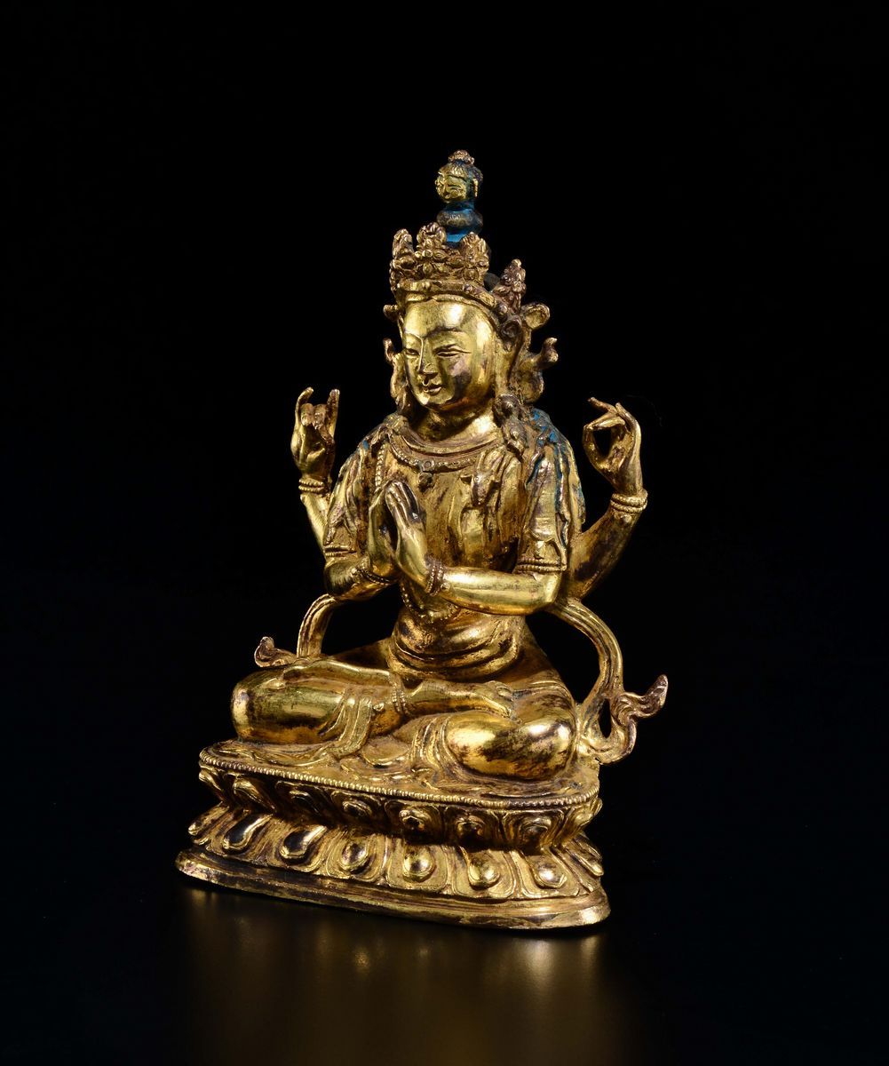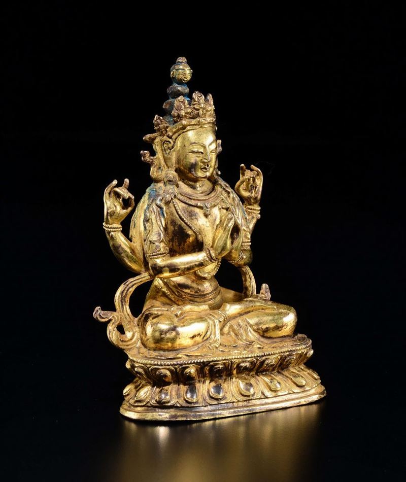 Figura di Caturbhuja-Avalokitesvara in bronzo dorato seduto su doppio fiore di loto, Cina, Dinastia Qing, XIX secolo