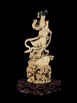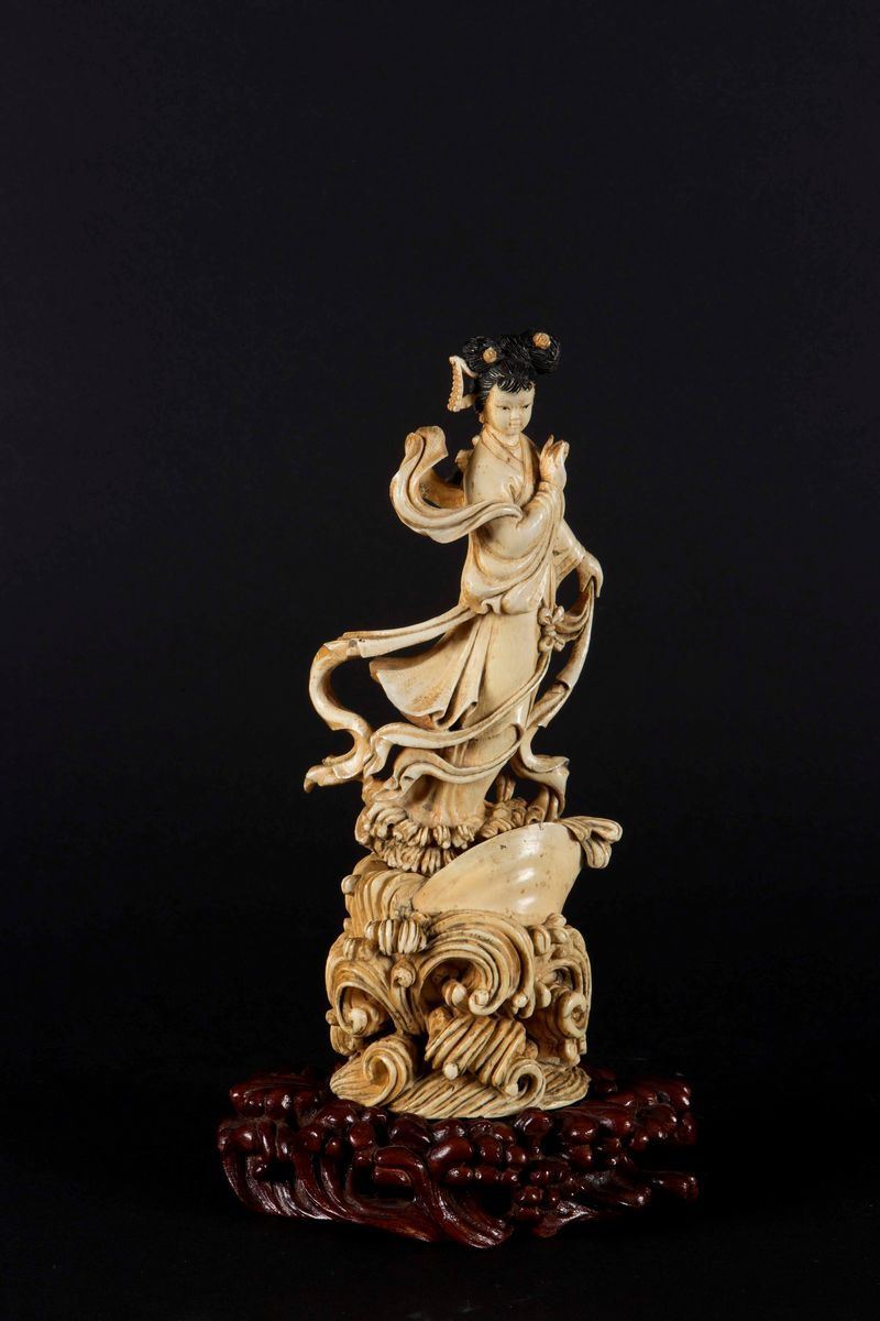 Figura di Guanyin in avorio con capelli neri eretta su conchiglia tra onde, Cina, inizio XX secolo