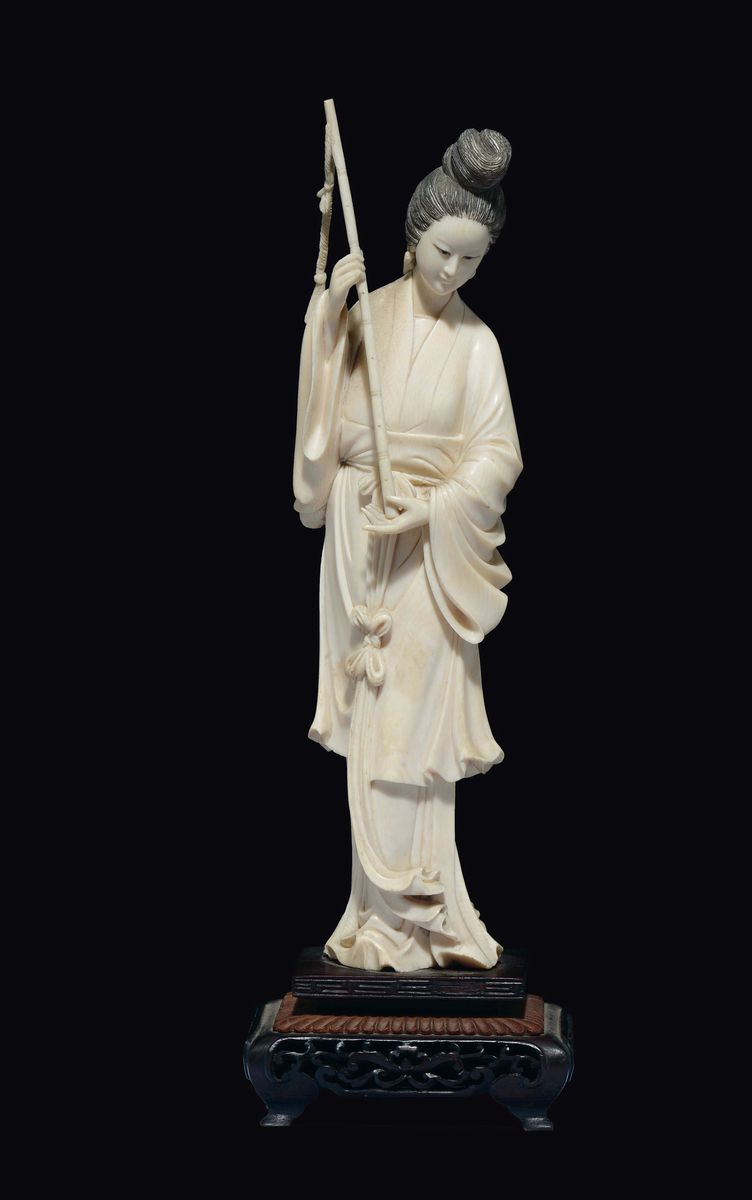 Figura di Guanyin scolpita in avorio con stendardo, Cina, inizio XX secolo