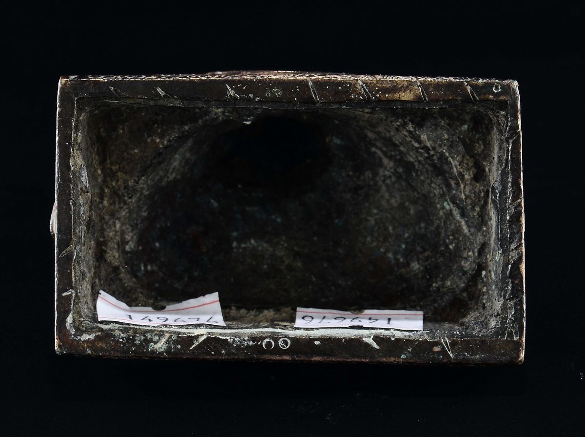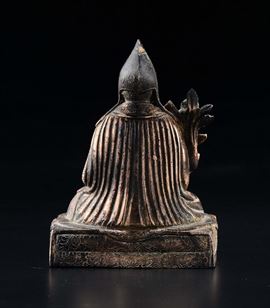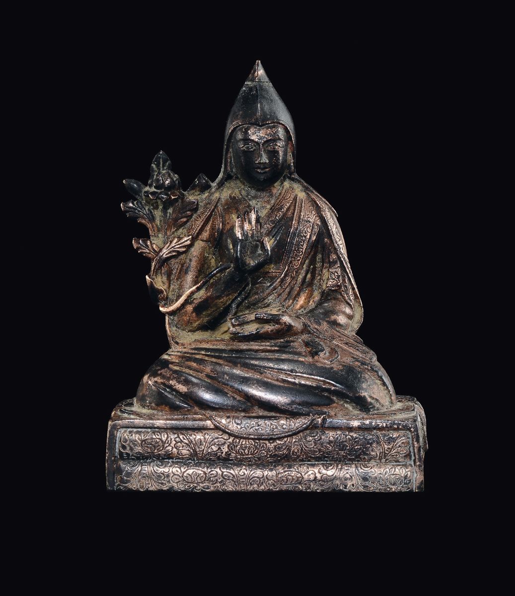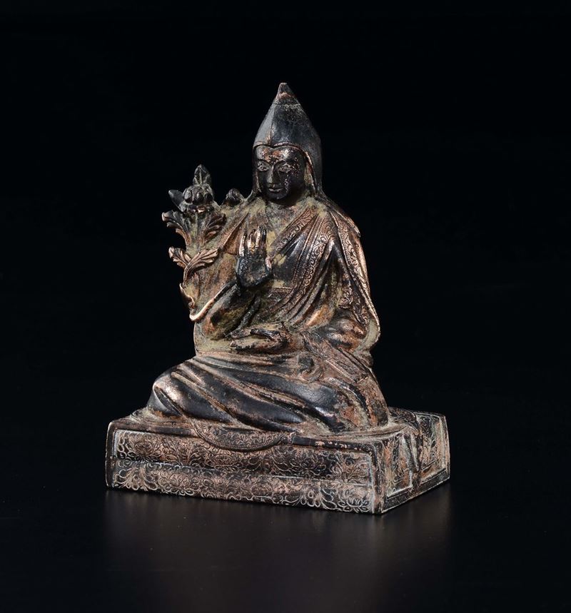 Figura di Lama seduto in bronzo con tracce di doratura con libro in mano, Tibet, XVIII secolo