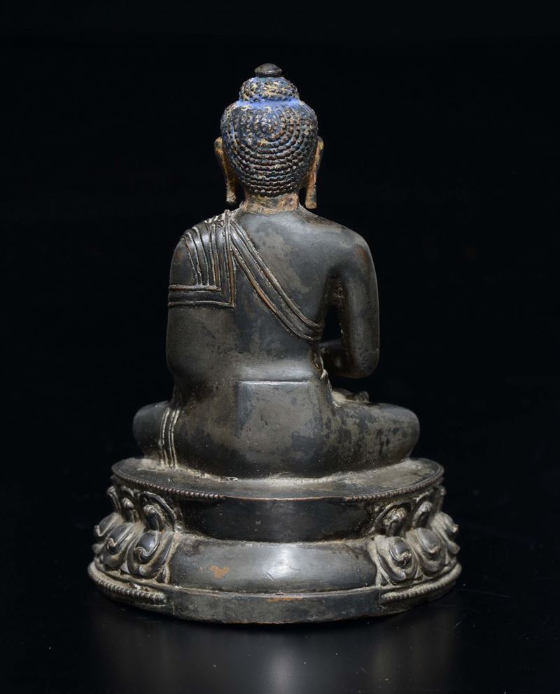 Figura di Sakyamuni in bronzo argentato su doppio fiore di loto, Cina, Dinastia Ming, XVI secolo