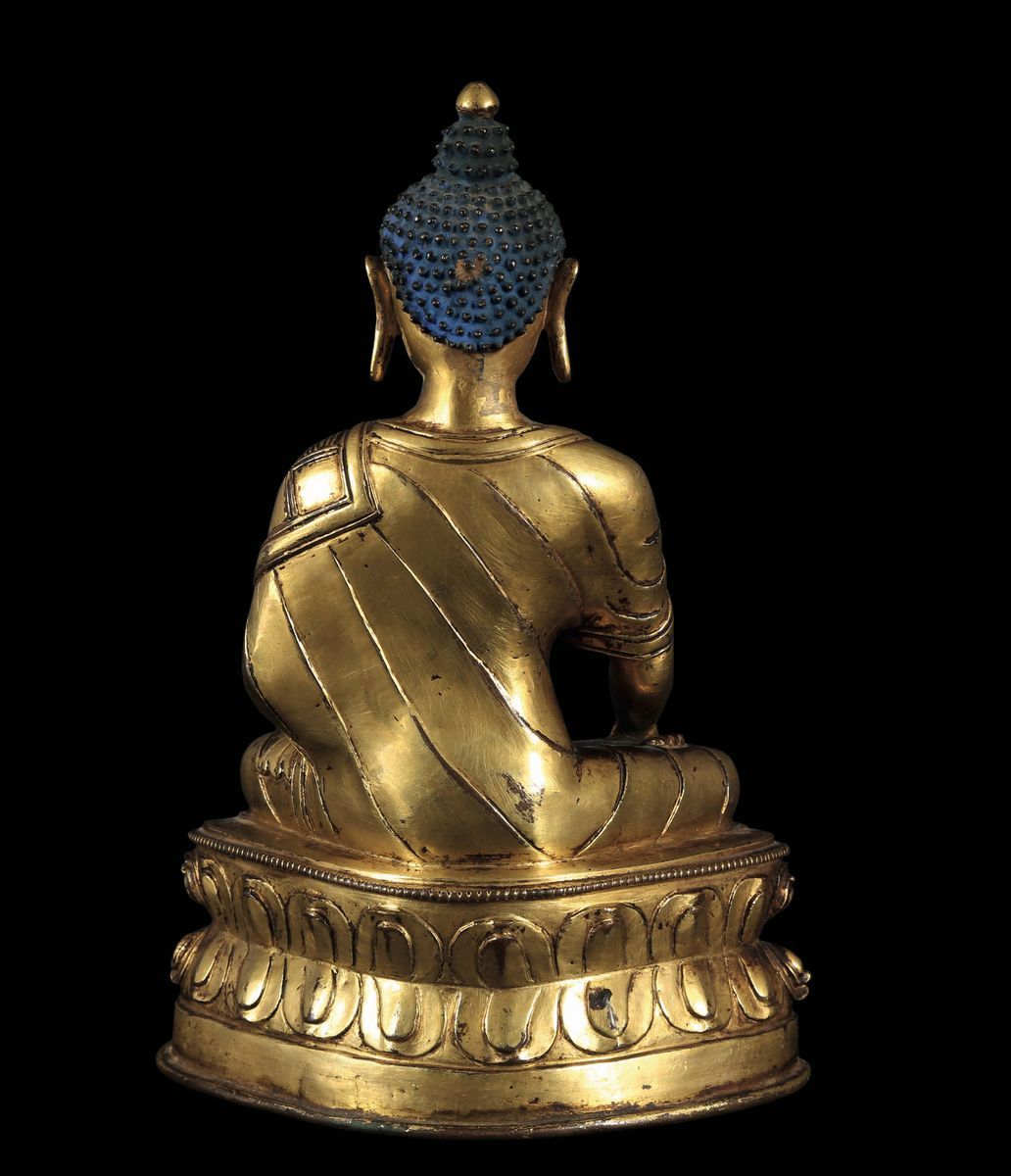 Figura di Sakyamuni in bronzo dorato con vajra ai sui piedi seduto su doppio fiore di loto, Tibet, XVI secolo