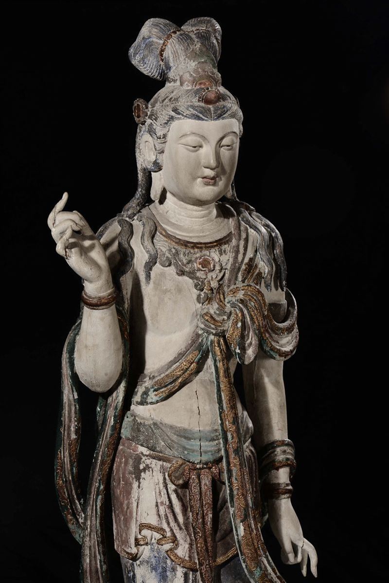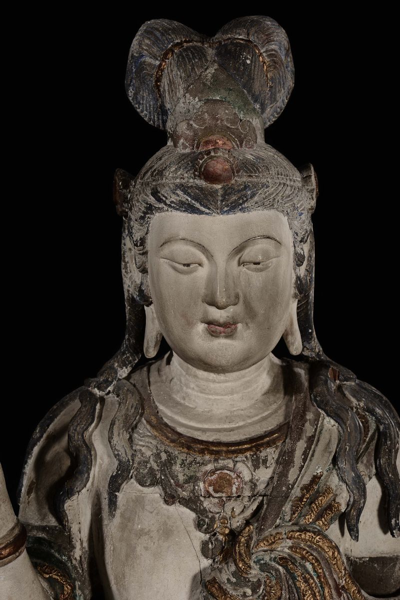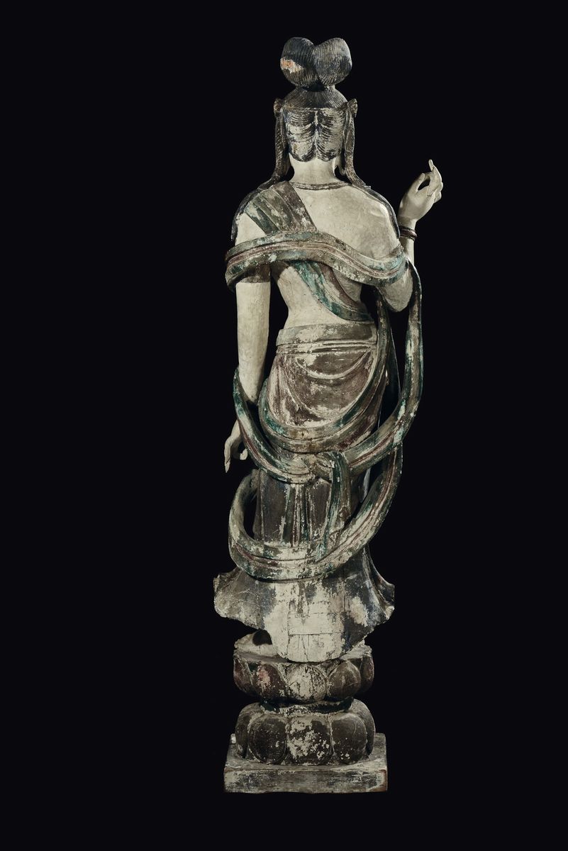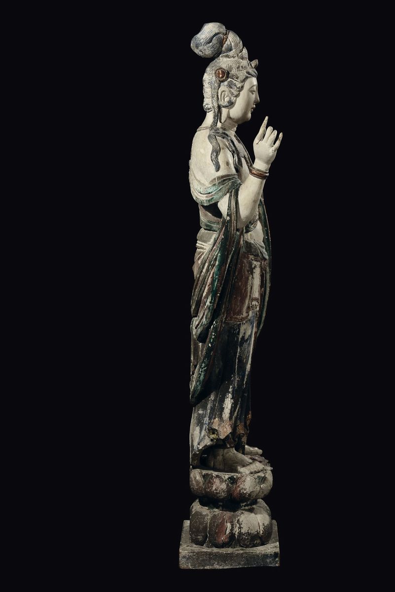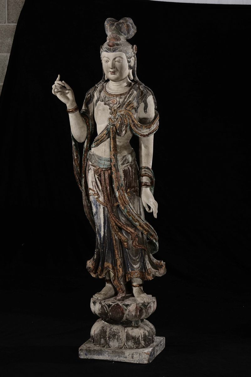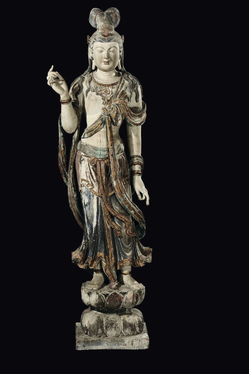 Grande e importante figura di Bodhisattva eretto su fiore di loto scolpita in legno con policromia e dorature, Cina, Dinastia Ming, XV secolo