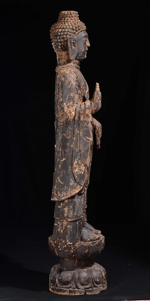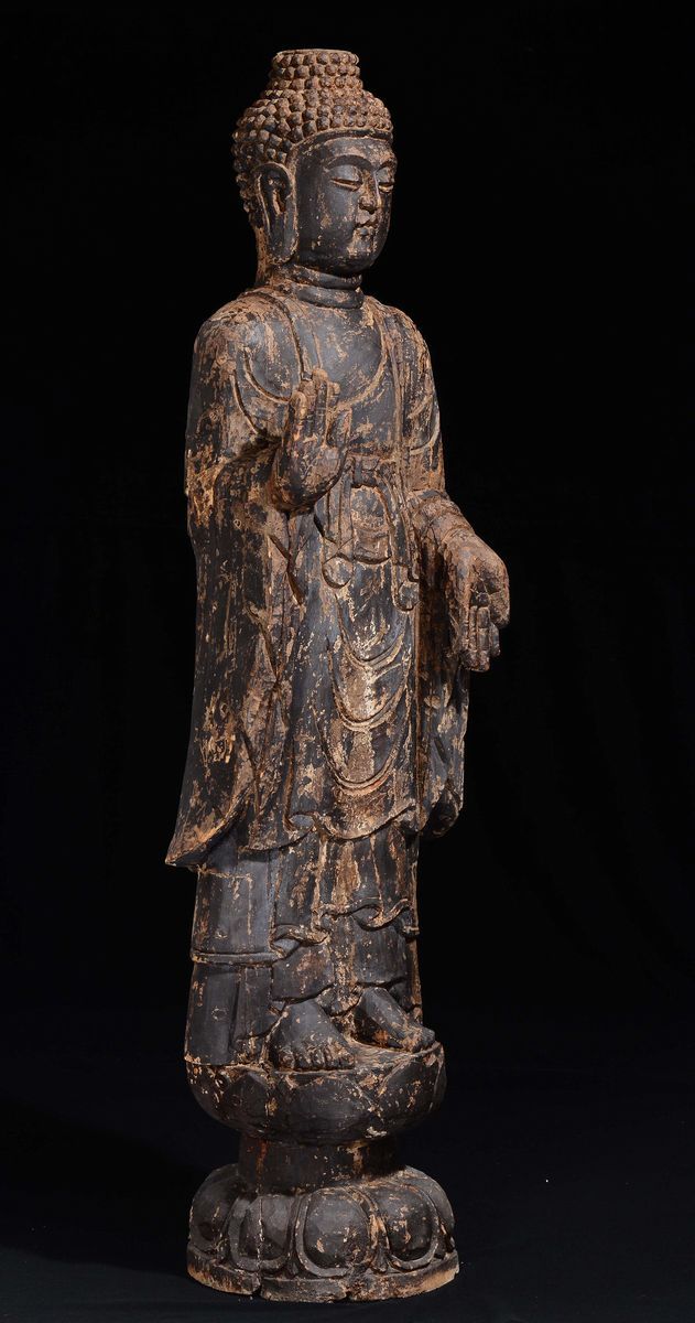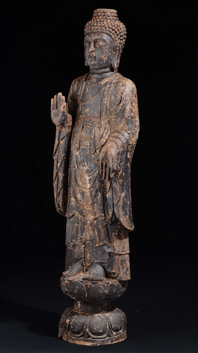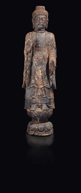 Grande figura di Buddha eretto su fiore di loto in legno con tracce di policromia, Cina, Dinastia Ming, XVII secolo