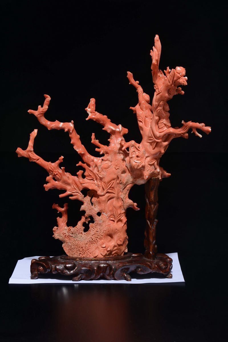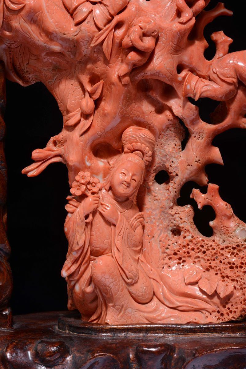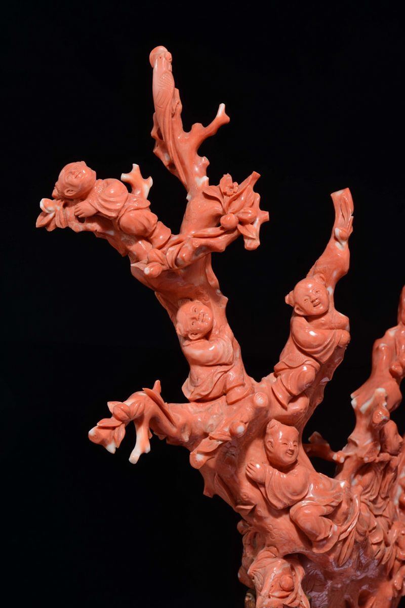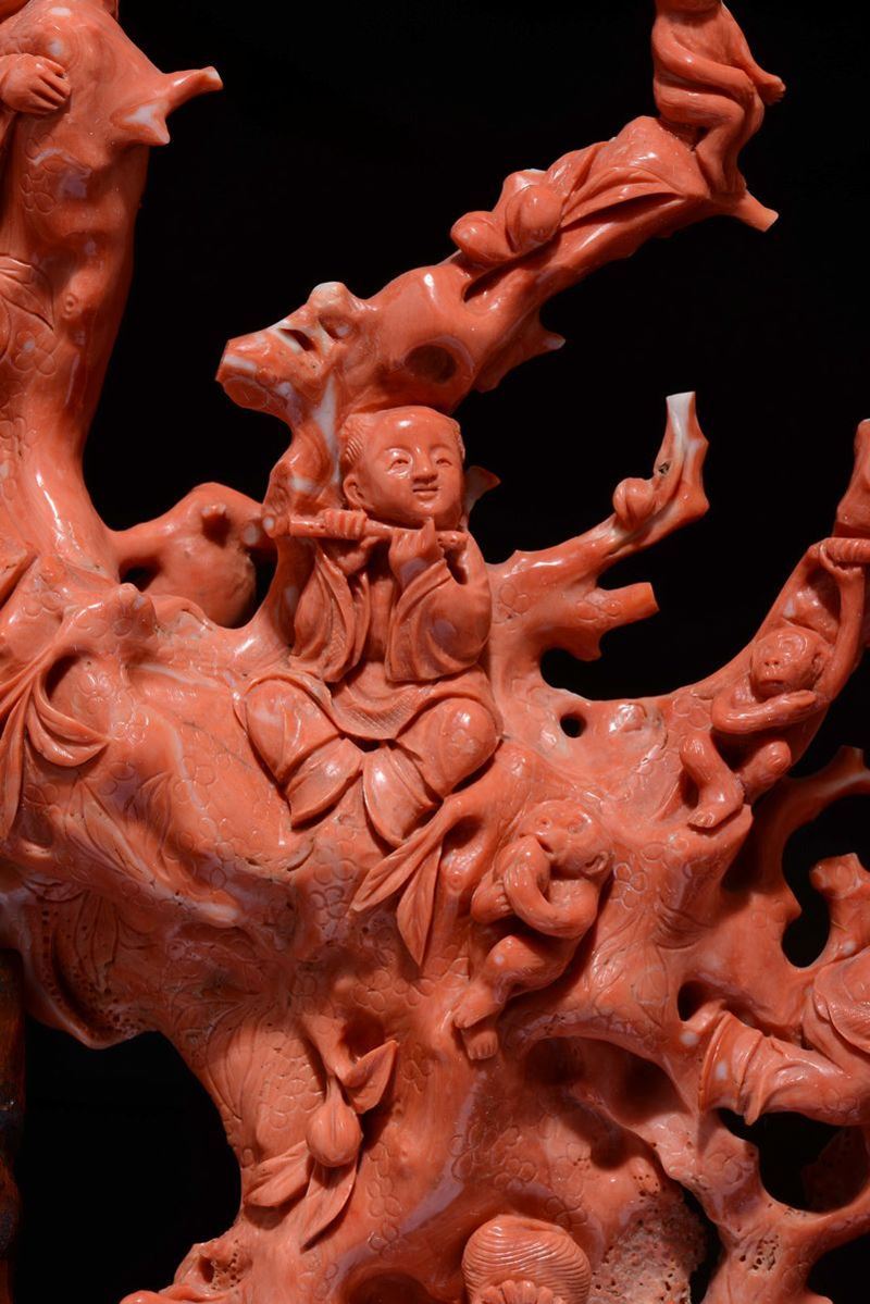 Grande gruppo scolpito in corallo raffigurante Guanyin tra scimmiette e fanciulli musicanti, Cina, inizio XX secolo