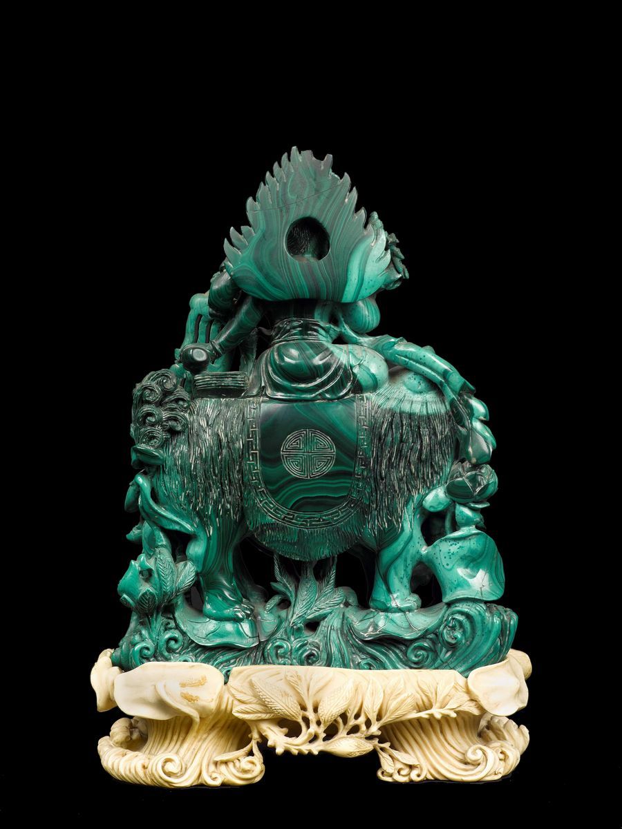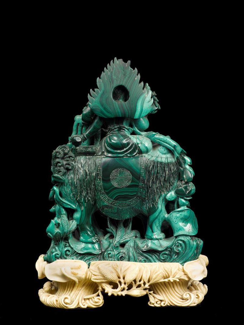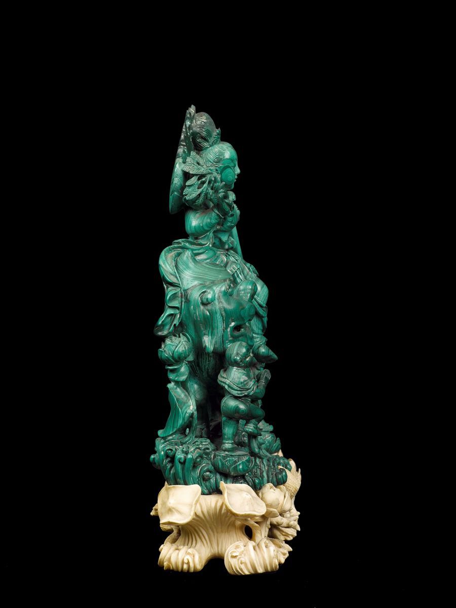 Gruppo finemente scolpito in malachite raffigurante Guanyin sopra cane di Pho e fanciulli con base in avorio, Cina, Dinastia [..]