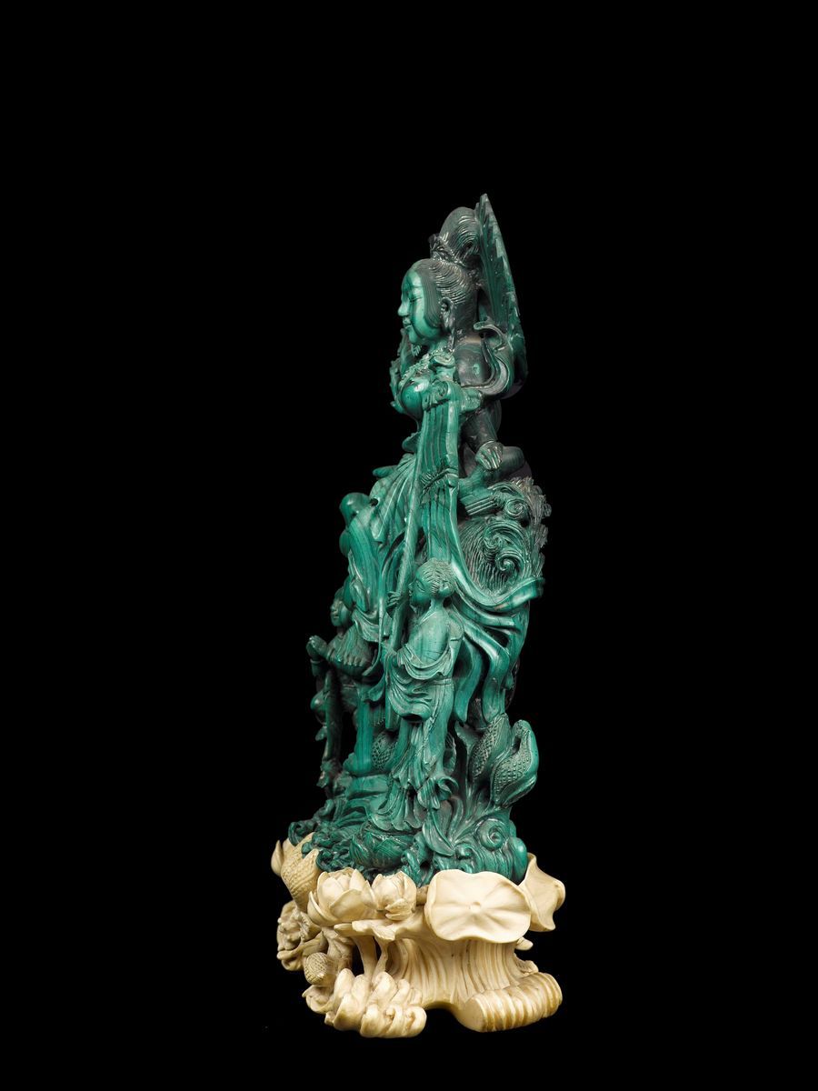 Gruppo finemente scolpito in malachite raffigurante Guanyin sopra cane di Pho e fanciulli con base in avorio, Cina, Dinastia Qing, fine XIX secolo