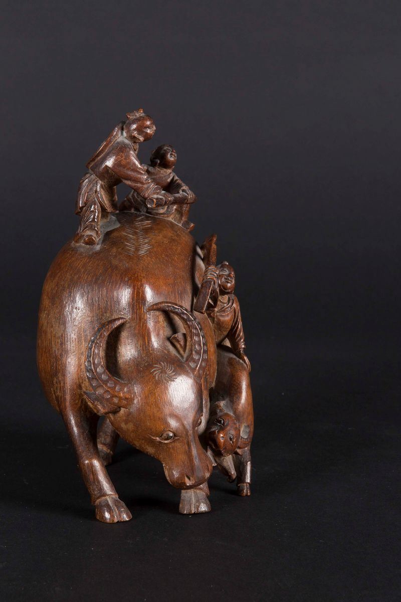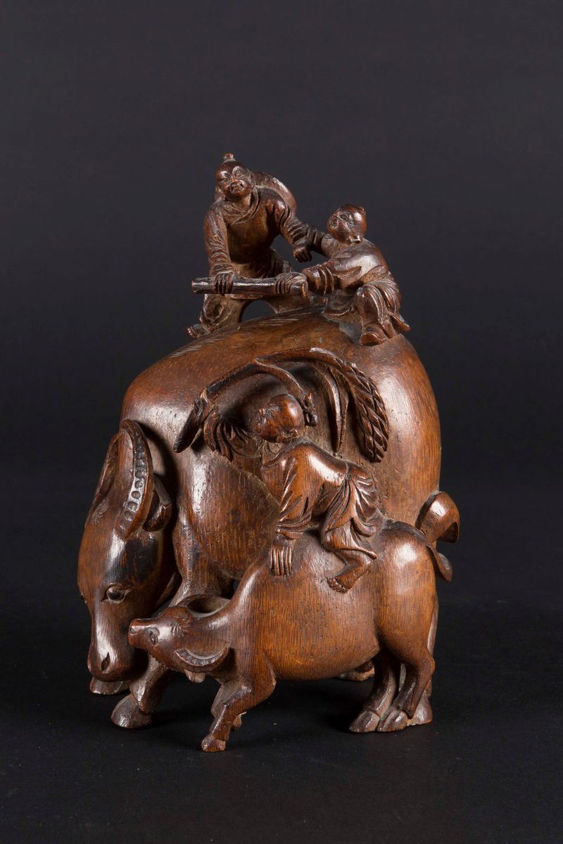 Gruppo scolpito in bamboo raffigurante bufalo con fanciulli che giocano, Cina, Dinastia Qing, XVIII secolo