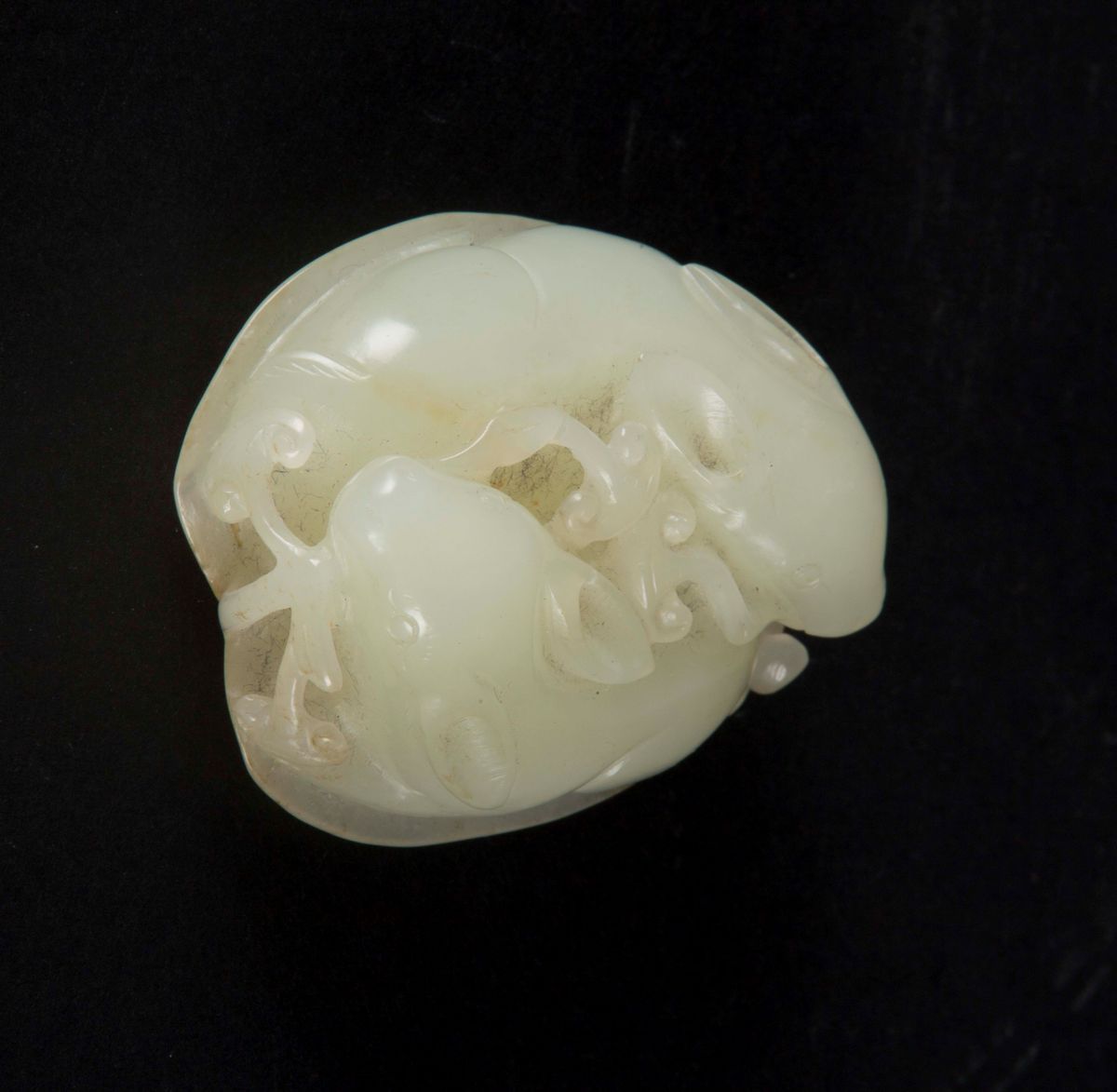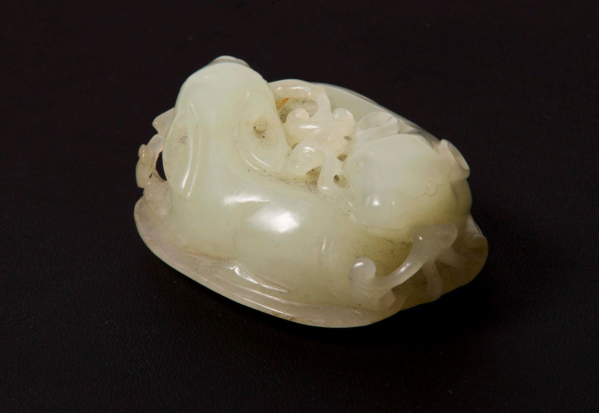 Gruppo scolpito in giada bianca raffigurante due cerbiatti con funghi in bocca, Cina, Dinastia Qing, XIX secolo