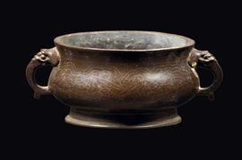 Incensiere con manici in bronzo con decoro di pipistrelli, Cina, Dinastia Ming, XVII secolo