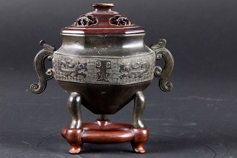 Incensiere tripode in bronzo a decoro geometrico d’ispirazione arcaica con coperchio in legno, Cina, Dinastia Ming, XVII secolo