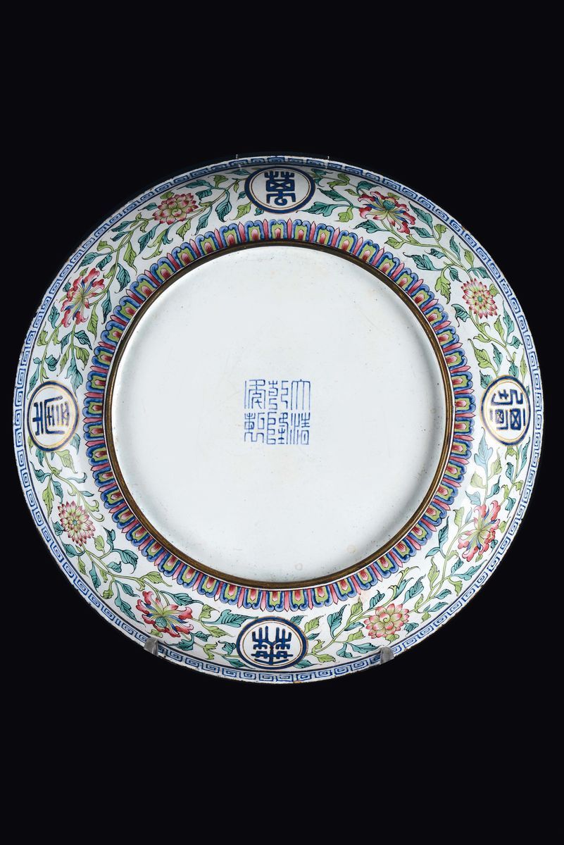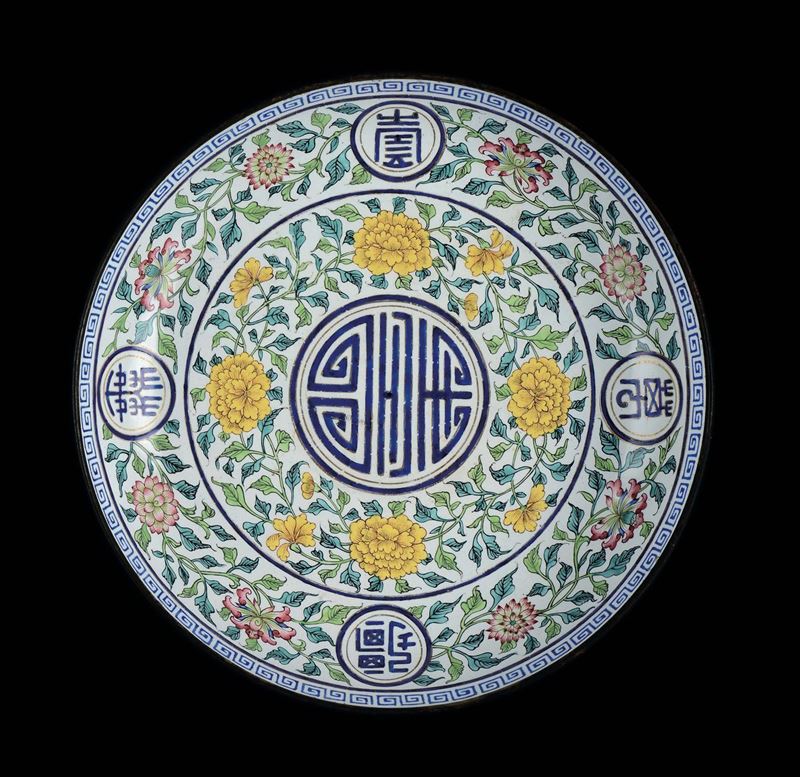 Piatto in metallo smaltato a decoro floreale ed ideogrammi entro riserve, Cina, Dinastia Qing, XIX secolo