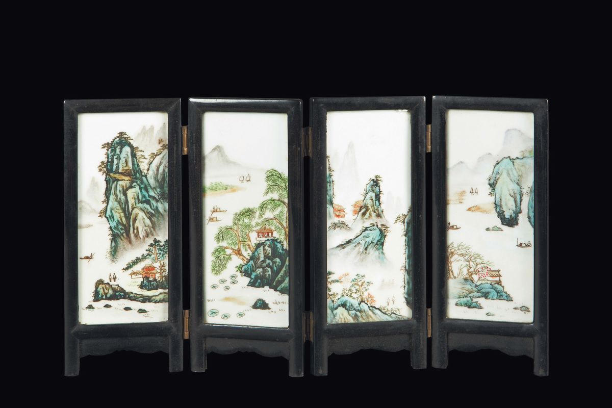 Piccolo paravento con placche in porcellana raffiguranti paesaggio fluviale, Cina, Dinastia Qing, XIX secolo