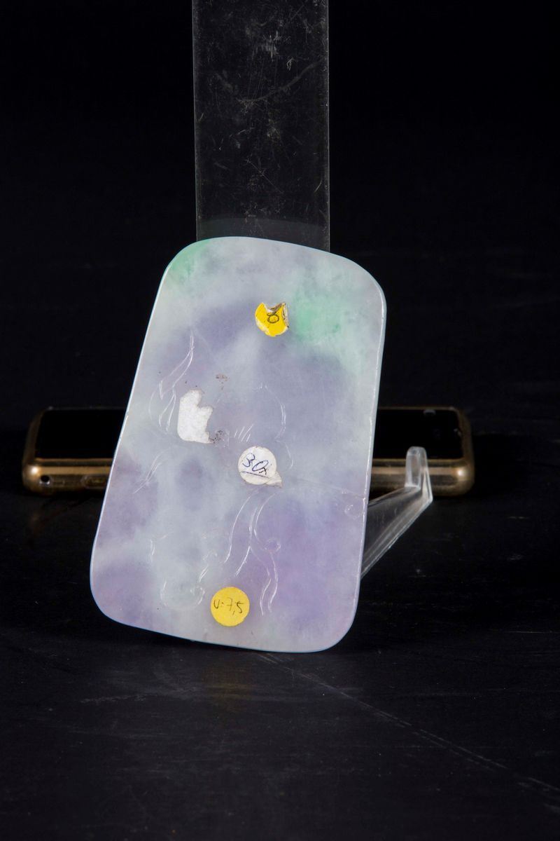 Placca in giadeite lavanda e verde mela con figure di draghi a rilievo, Cina, XX secolo