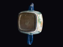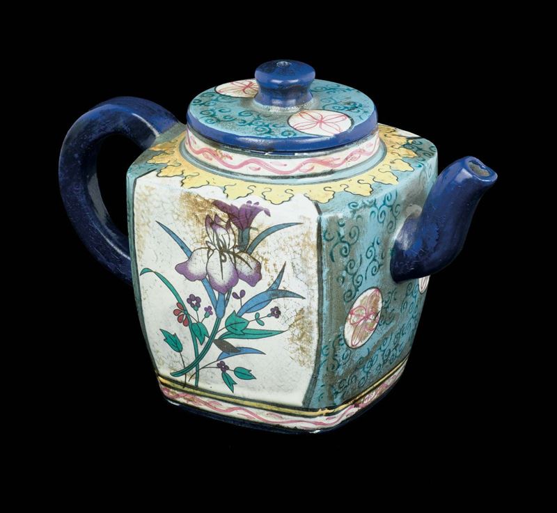Rara teiera con coperchio in terracotta Yixing a smalti policromi raffiguranti fiori, Cina, Dinastia Qing, XIX secolo