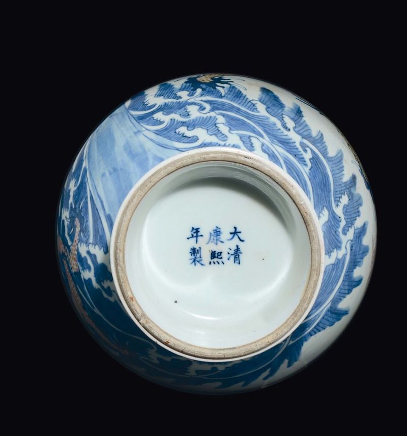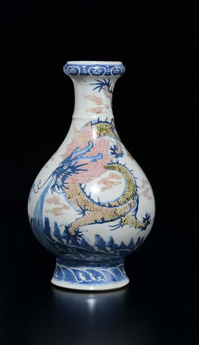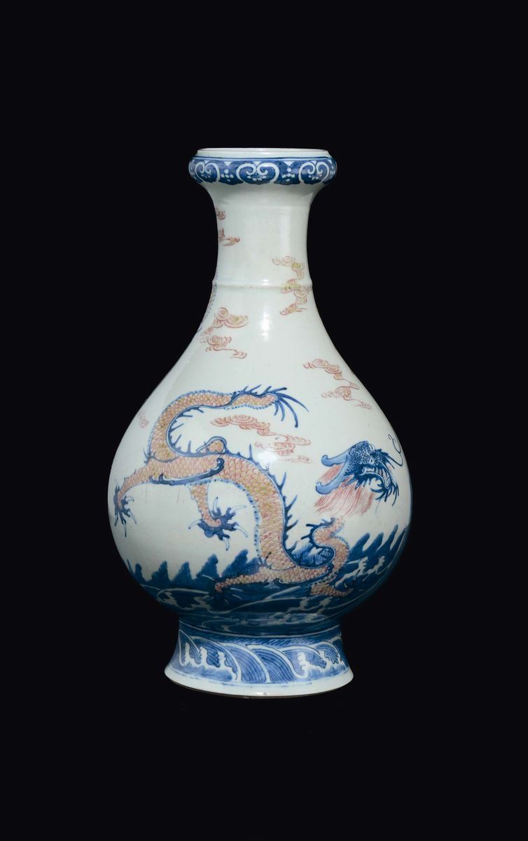 Vaso in porcellana a decoro bianco, blu e rosso ferro raffigurante dragone, Cina, Dinastia Qing, XIX secolo