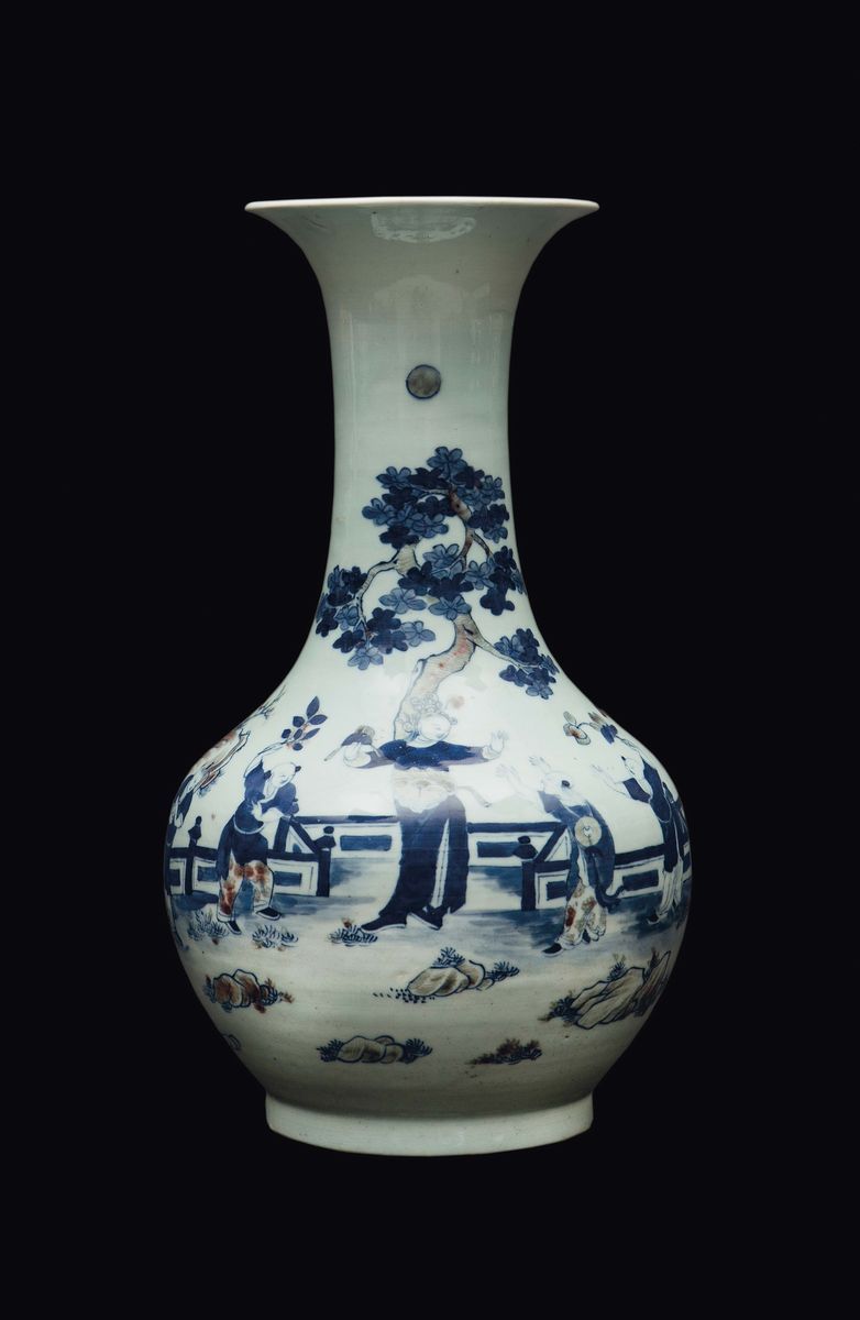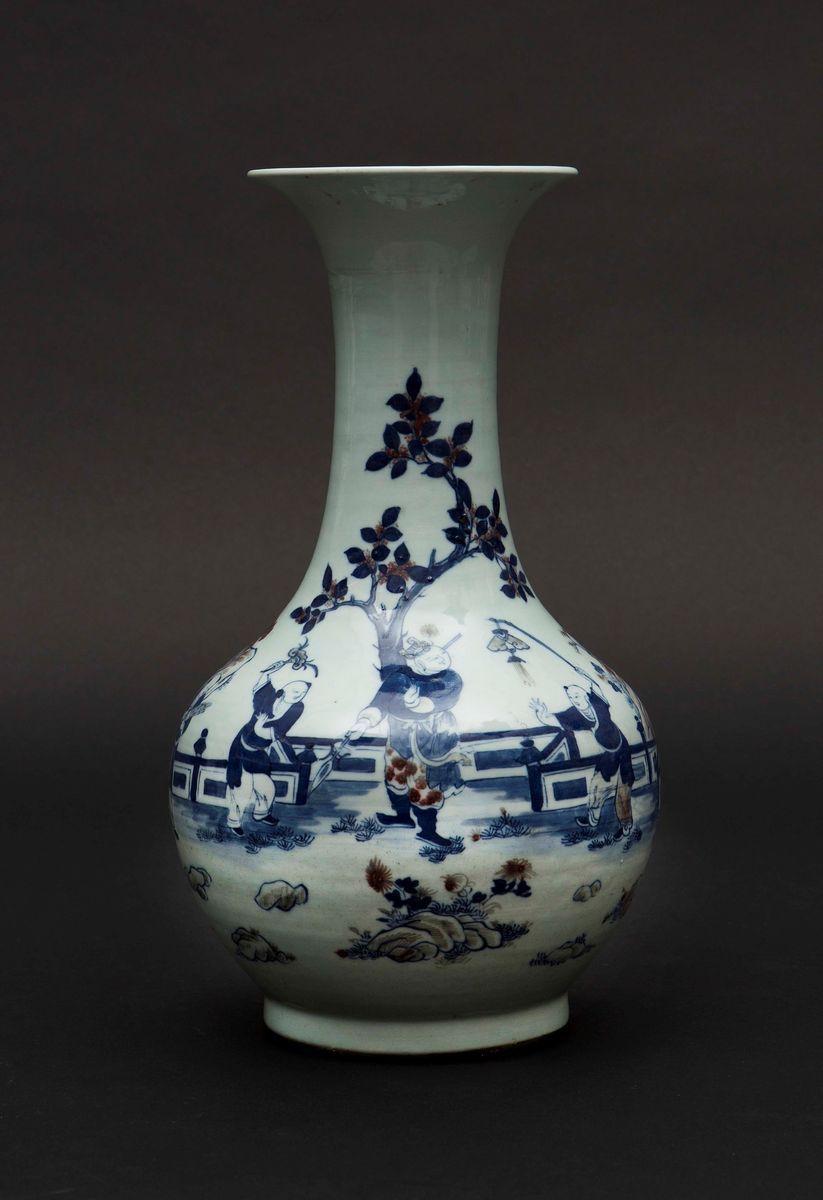 Vaso in porcellana bianca e blu e tocchi rosso ferro con raffigurazione di fanciulli che giocano, Cina, Dinastia Qing, XIX [..]