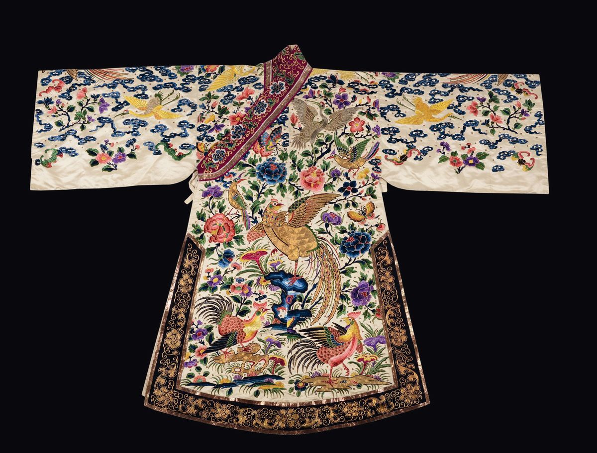 Veste in seta riccamente ricamata con raffigurazioni di galli, gru e fagiani su sfondo floreale, Cina, Dinastia Qing, XIX [..]