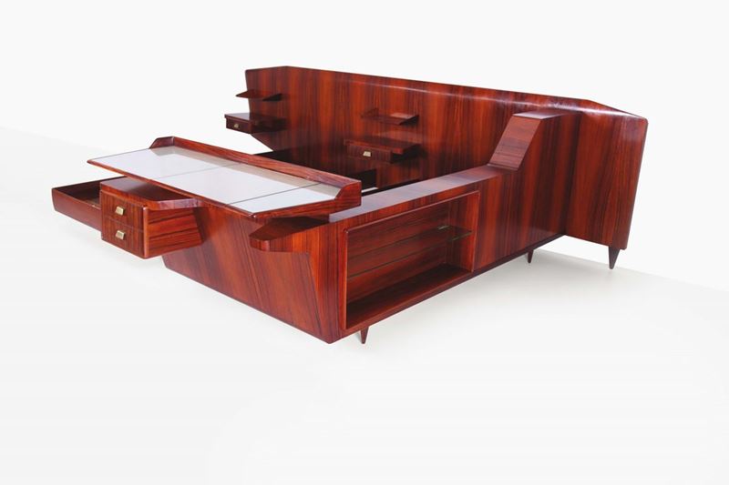 Letto in palissandro con testata asimmetrica e mensole pensili, libreria incorporata con ripiani in vetro e toletta con specchio ribaltabile. Dettagli in metallo. Esecuzione ad opera della falegnameria di Egidio Prosepio di Barzanò. Pezzo unico. Certificato Gio Ponti Archives 16082/000. Prod. Falegnameria di Egidio Prosepio di Barzanò, Italia, 1940 ca cm 355x100x250