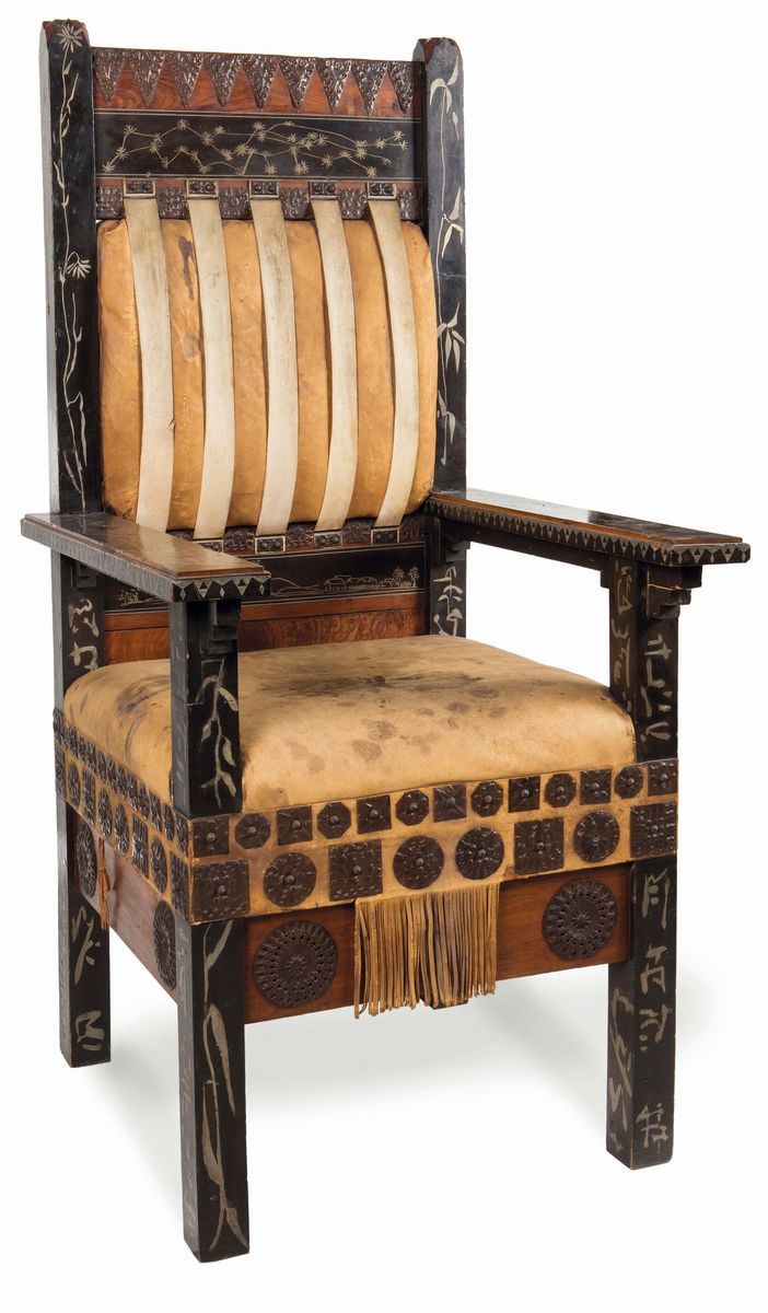Grande poltrona in legno in parte ebanizzato, con intarsi in peltro e applicazioni in rame cesellato. Seduta e schienale in pergamena con cinghie ribattute e frange in pelle. Seduta cm 64x65; altezza cm 135