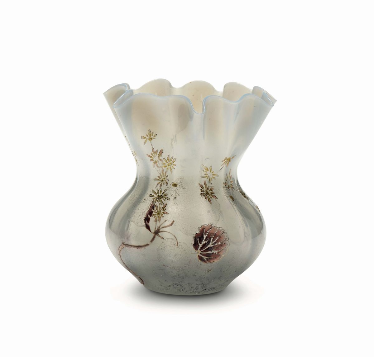 Vaso a fazzoletto in vetro opalescente con decoro a smalti. Altezza cm 17; diametro cm 15Firma sotto la base