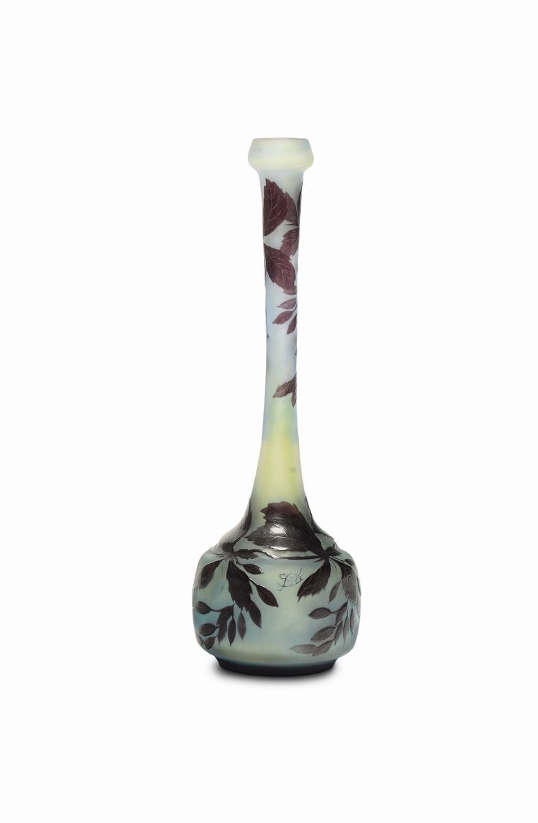 Vaso soliflore in vetro cammeo con decoro di glicini. Altezza cm 31,5Firma a cammeo