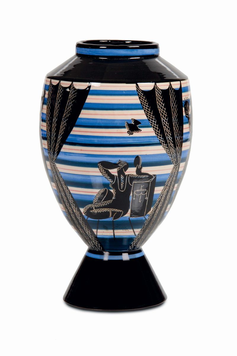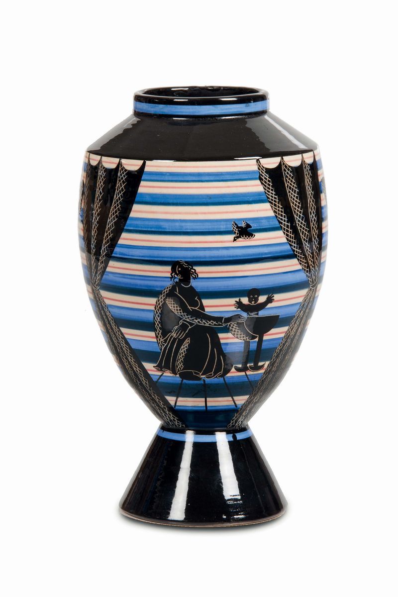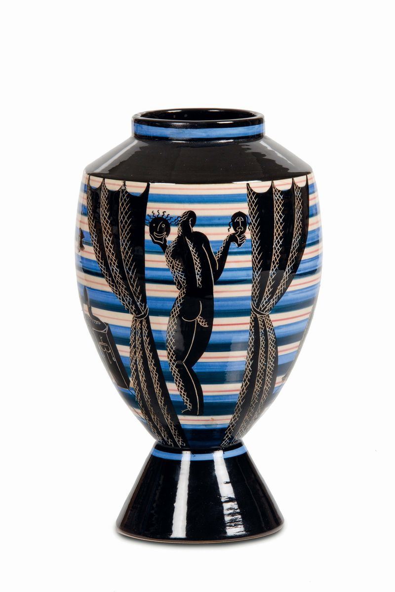 Vaso troncoconico su alto basamento in maiolica con decoro a fasce policrome e figure classiche in nero parzialmente grafite. Altezza cm 28,5Marchio sotto la base