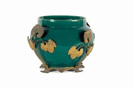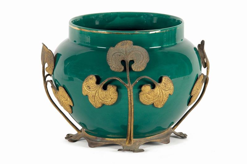 Cachepot in ceramica smaltata dentro montatura in ottone dorato a motivi floreali. Altezza cm 23; diametro cm 33