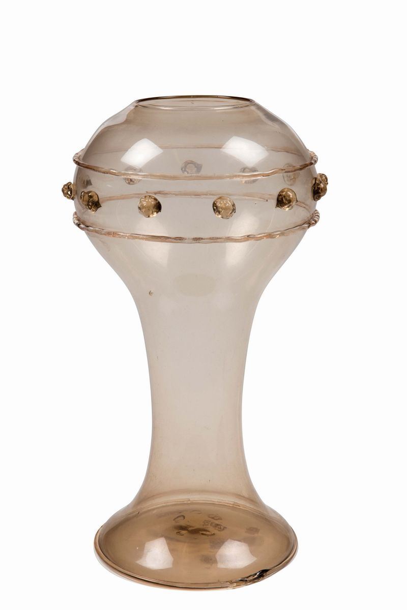 Vaso in vetro soffiato paglierino a balaustro con cordoli e morise applicate. Altezza cm 27; larghezza cm 12