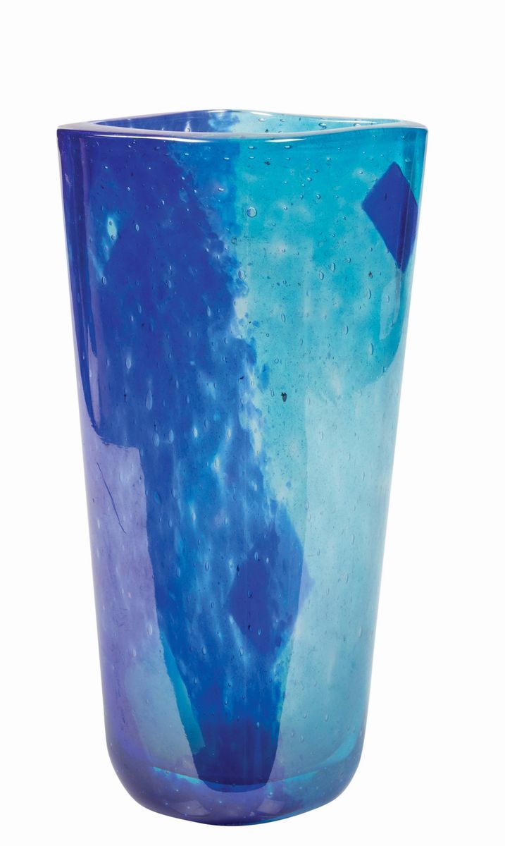Vaso tronco piramidale in vetro pesante con decoro a macchie e canne multicolori. Altezza cm 28,5
