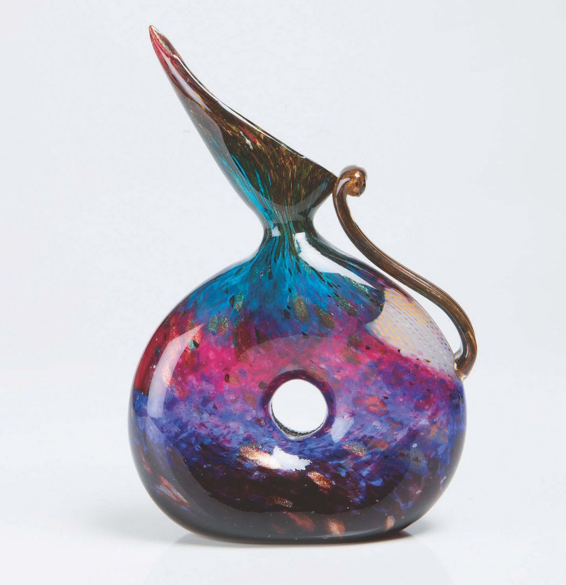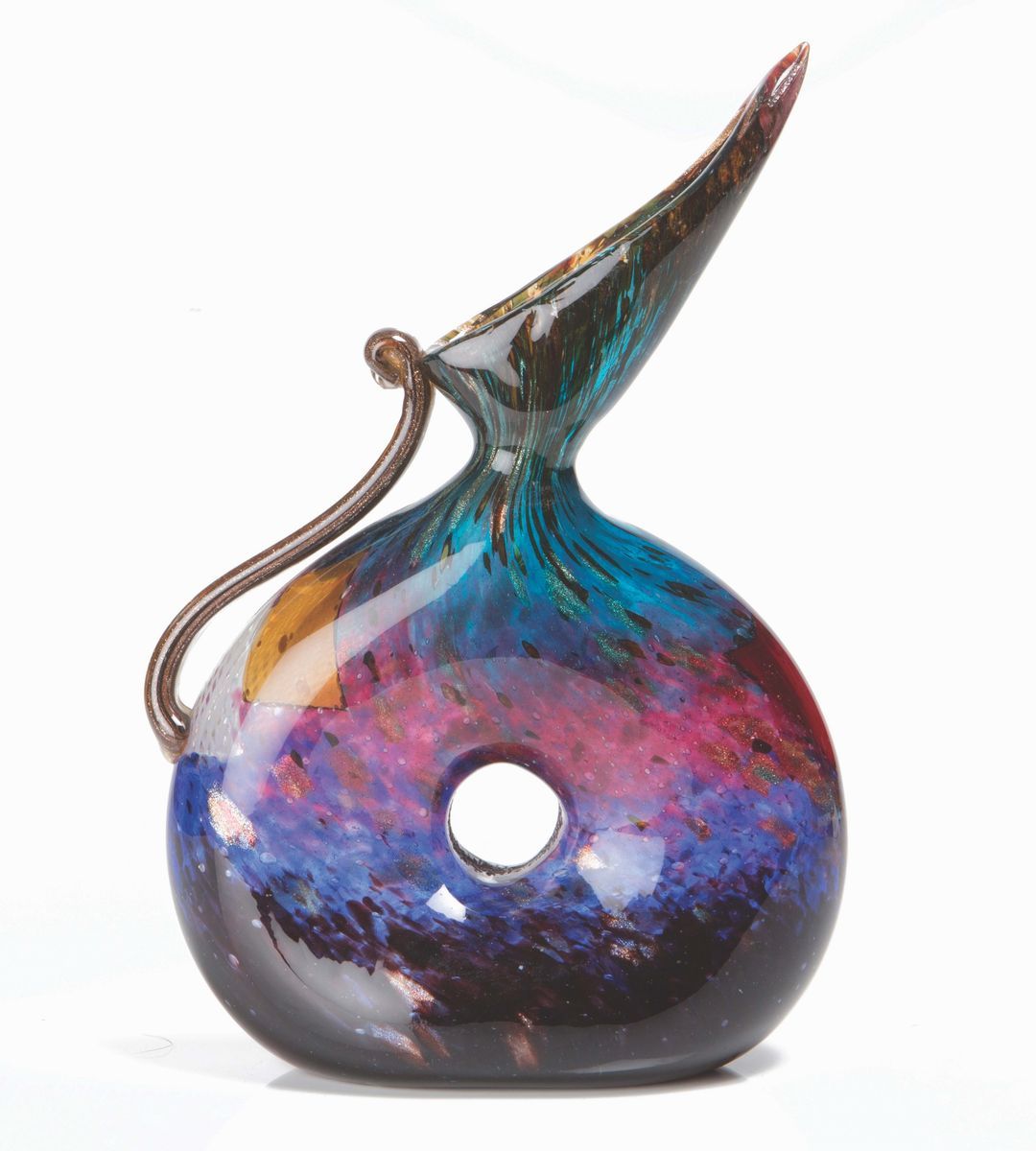 Vaso serie Eldorado in vetro soffiato con foro centrale, ansa e lungo collo a becco, con decoro a tessere e macchie multicolori. Altezza cm 27,5