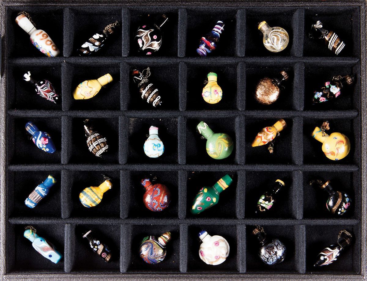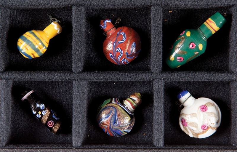 Collezione di trenta piccoli flaconi in vetro a lume con decoro a canne policrome e murrine. Diverse dimensioni e forme