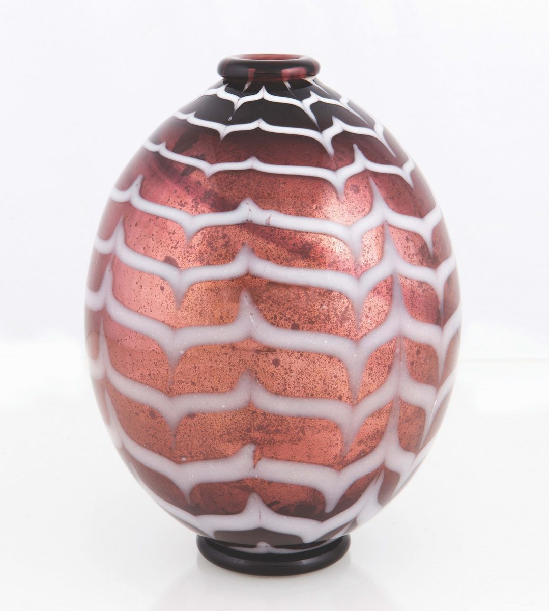 Vaso in vetro soffiato ciclamino di forma ovoidale con lavorazione “Fenicia” a canne lattimo e superficie interna specchiata. Altezza cm 21