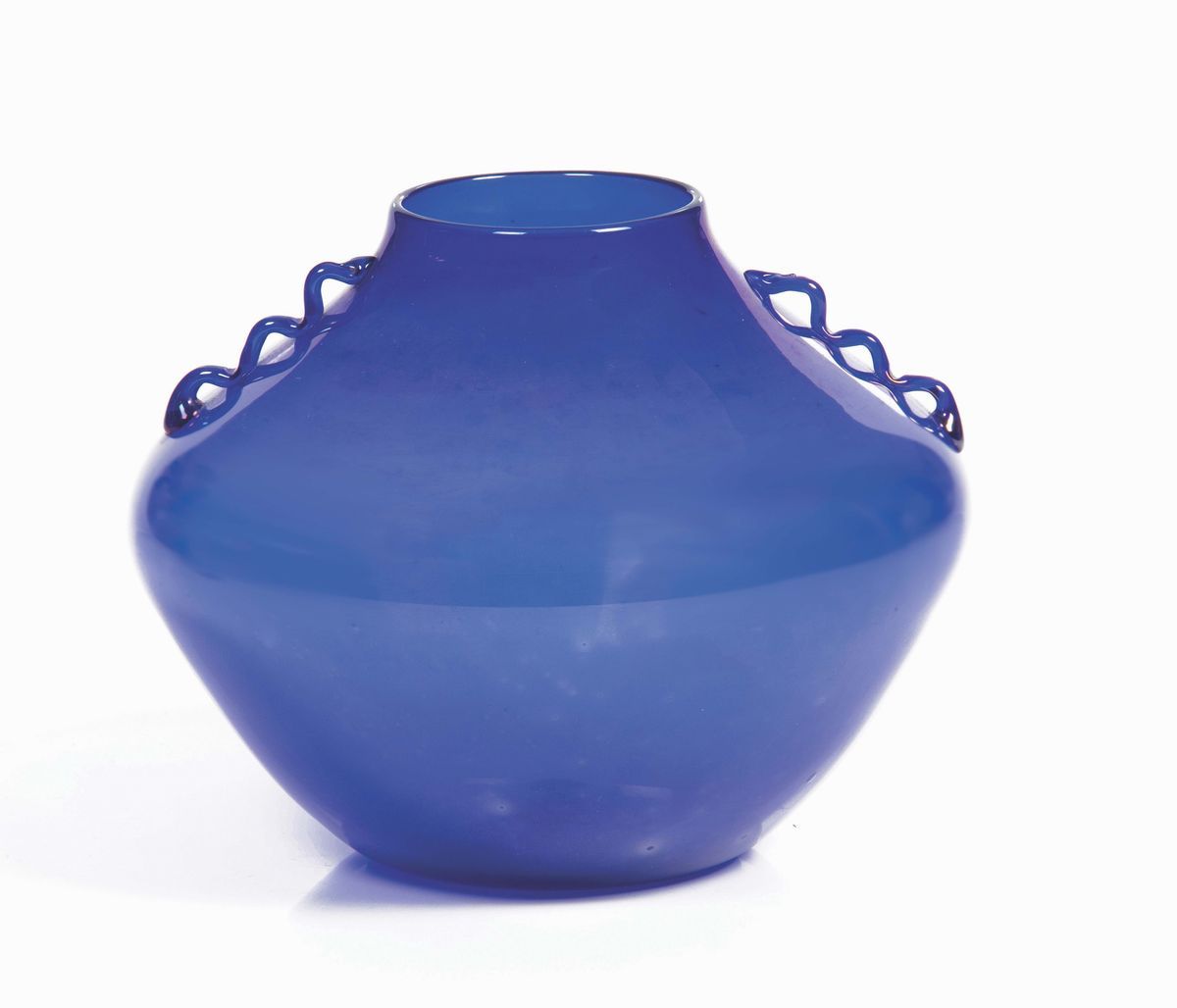 Piccolo vaso in vetro soffiato blu iridato con anse applicate. Altezza cm 11